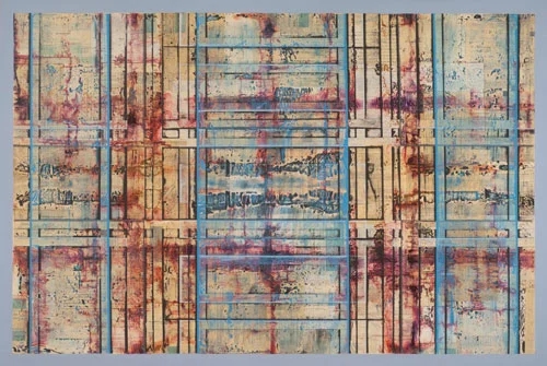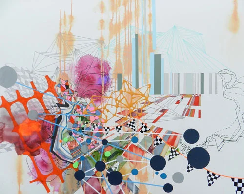 Heather Patterson’s imagery is motivated by her observations of nature and the built environment. She implements visuals such as blueprints, networking graphs, geographic patterns and forms, natural disasters and phenomena, weather charts, topographic maps. By restructuring and layering these elements with mixed media into new landscapes she creates a symbiosis of the organic and geometric man-made world.