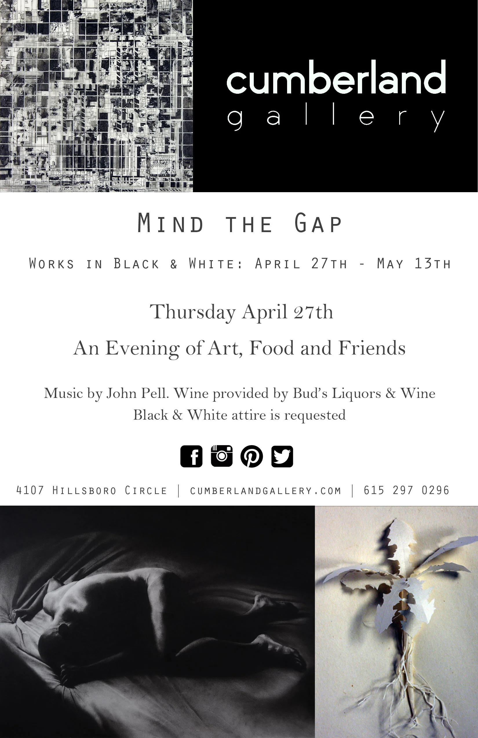 On April 27th, please join us for a classic evening of art, food, and friends, with music by John Pell and a wine provided by Bud's Liquors and Wine. Black & White attire is requested.